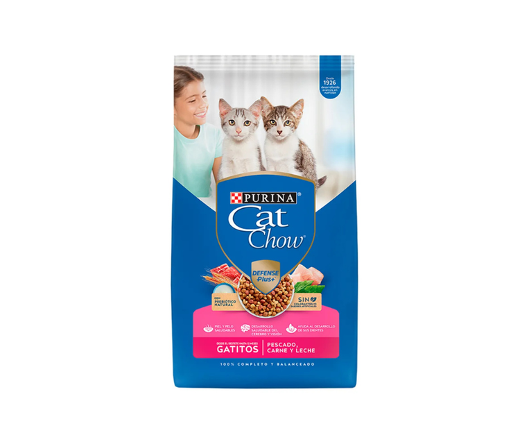 Es un alimento seco completo y balanceado para gatitos hasta los 12 meses, formulado para apoyar su crecimiento saludable desde los primeros días. Cat Chow Gatitos con Defense Plus combina proteínas de origen animal con prebióticos naturales, DHA, vitaminas y minerales esenciales para fortalecer el sistema inmune, el desarrollo cerebral y la salud general del felino. Libre de colorantes y sabores artificiales, está diseñado para ser altamente nutritivo y apetecible.