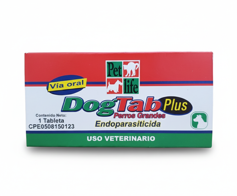 Dog Tab Plus es un desparasitante oral en tableta para perros grandes (hasta 35 kg), desarrollado por Pet Life. Está diseñado para el control y eliminación de parásitos internos como gusanos redondos y planos, además de ofrecer protección frente a algunos parásitos externos. Su acción se centra en mantener al perro libre de infestaciones que comprometen su salud digestiva y general.
