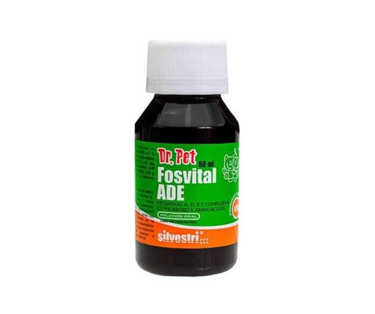 Fosvital ADE es un complejo vitamínico y mineral en solución oral, formulado con Vitaminas A, D3, E, complejo B, fósforo y aminoácidos. Está indicado para perros y gatos en estados de anemia nutricional, convalecencia post-operatoria, procesos de ehrlichiosis y babesiosis, así como en carencias vitamínicas y minerales. Actúa como antianémico, antitóxico y hepatoprotector, siendo útil en casos de infestaciones severas de garrapatas, parásitos gastrointestinales y afecciones hepáticas.
